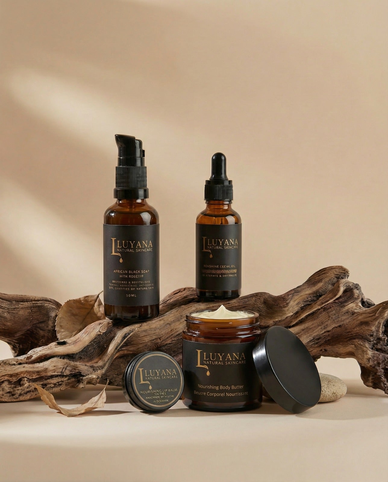 African Black Soap with Rosehip Cleanser · Renewing Facial Oil · Nourishing Body Butter · Nourishing Lip Balm with Tea Tree